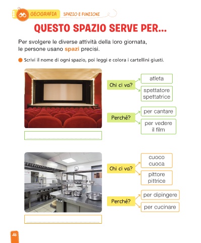 Scrivi il nome di ogni spazio, poi leggi e colora i cartellini giusti.
