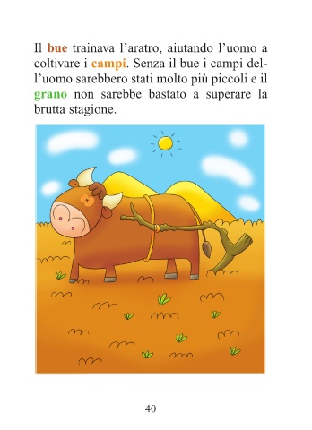 01-56_elefante e cammello 30-01-2009 11:42 Pagina 40 Il bue trainava l’aratro, aiutando l’uomo a coltivare i campi. Senza il bue i campi del- l’uomo sarebbero stati molto più piccoli e il grano non sarebbe bastato a superare la brutta stagione. 40