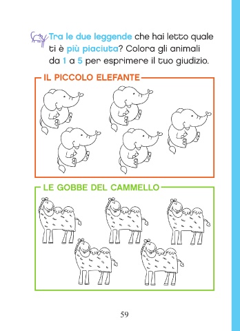 57-64_operative 30-01-2009 11:44 Pagina 59 E Tra le due leggende che hai letto quale ti è più piaciuta? Colora gli animali da 1 a 5 per esprimere il tuo giudizio. IL PICCOLO ELEFANTE LE GOBBE DEL CAMMELLO 59
