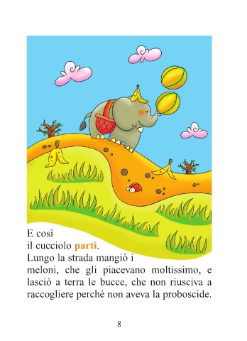 01-56_elefante e cammello 30-01-2009 11:42 Pagina 8 E così il cucciolo partì. Lungo la strada mangiò i meloni, che gli piacevano moltissimo, e lasciò a terra le bucce, che non riusciva a raccogliere perché non aveva la proboscide. 8