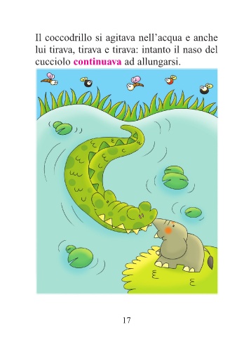 01-56_elefante e cammello 30-01-2009 11:42 Pagina 17 Il coccodrillo si agitava nell’acqua e anche lui tirava, tirava e tirava: intanto il naso del cucciolo continuava ad allungarsi. 17
