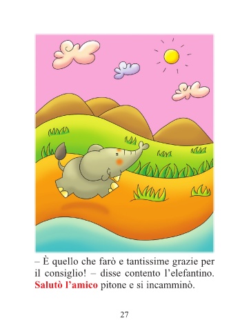 01-56_elefante e cammello 30-01-2009 11:42 Pagina 27 – È quello che farò e tantissime grazie per il consiglio! – disse contento l’elefantino. Salutò l’amico pitone e si incamminò. 27