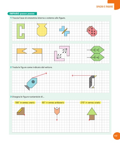 SPAZIO E FIGURE IMPARO passo passo 1 Traccia l’asse di simmetria interno o esterno alle figure. 2 Trasla le figure come indicato dal vettore. 3 Disegna le figure ruotandole di... 180° in senso orario 90° in senso antiorario 270° in senso orario 117