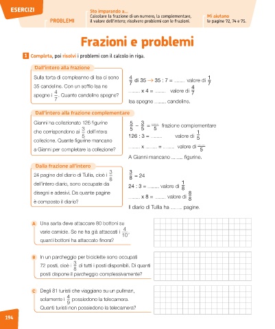 PROBLEMI il valore dell’intero; risolvere problemi con le frazioni. le pagine 72, 74 e 75.