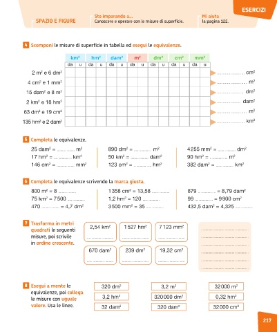 4 Scomponi le misure di superficie in tabella ed esegui le equivalenze.