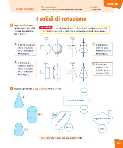 SPAZIO E FIGURE Conoscere le caratteristiche dei solidi di rotazione. la pagina 142.