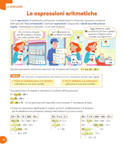 Questa espressione aritmetica riporta le tre situazioni del fumetto: 7 + 3 x 10 – 26 =