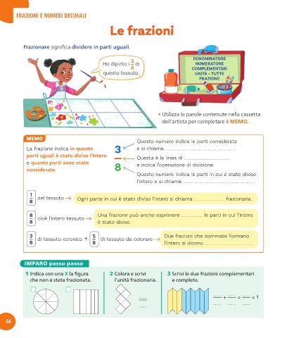 1 Indica con una X la figura 2 Colora e scrivi 3 Scrivi le due frazioni complementari