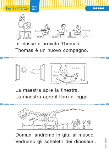 Per il rinforzo 21 In classe è arrivato Thomas. Thomas è un nuovo compagno. La maestra apre la finestra. La maestra apre il libro e legge. Domani andremo in gita al museo. © Gaia Edizioni Vedremo gli scheletri dei dinosauri.