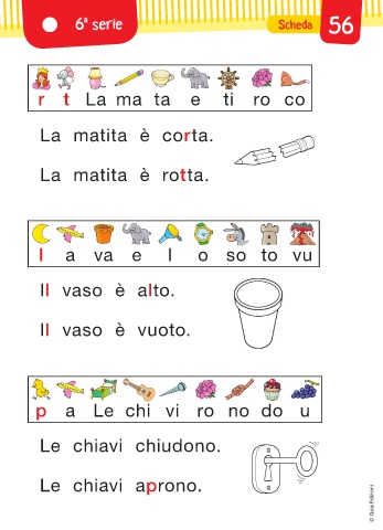 a 6 serie Scheda 56 r t La ma ta e ti ro co La matita è corta. La matita è rotta. l a va e I o so to vu Il vaso è alto. Il vaso è vuoto. p a Le chi vi ro no do u Le chiavi chiudono. Le chiavi aprono. © Gaia Edizioni