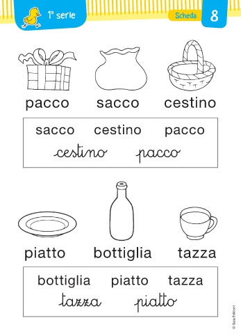 a 1 serie Scheda 8 pacco sacco cestino sacco cestino pacco <cestinø <paccø piatto bottiglia tazza bottiglia piatto tazza <tazza <piattø © Gaia Edizioni