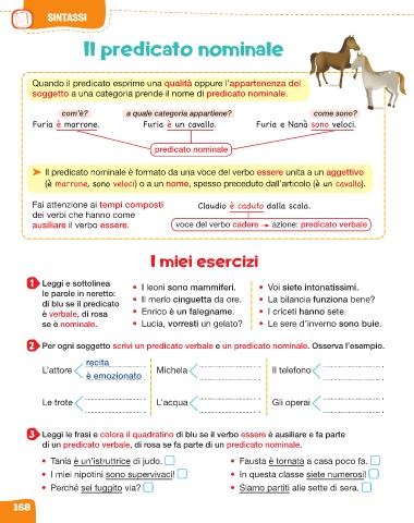 (è marrone, sono veloci) o a un nome, spesso preceduto dall’articolo (è un cavallo).