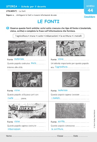 1 Osserva queste fonti antiche: scrivi sotto ciascuna che tipo di fonte è (materiale,