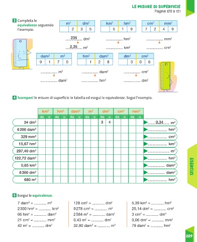 4 Scomponi le misure di superficie in tabella ed esegui le equivalenze. Segui l’esempio.